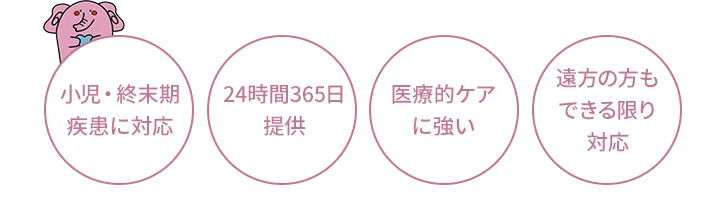 私たちの最大の強みは、24時間体制での対応です。緊急時にも迅速に対応し、ご利用者様とご家族の安心を第一に考えて行動します。私たちのチームは、経験豊富な看護師や医療スタッフで構成されており、迅速かつ的確なケアを提供するために日々努力しています。